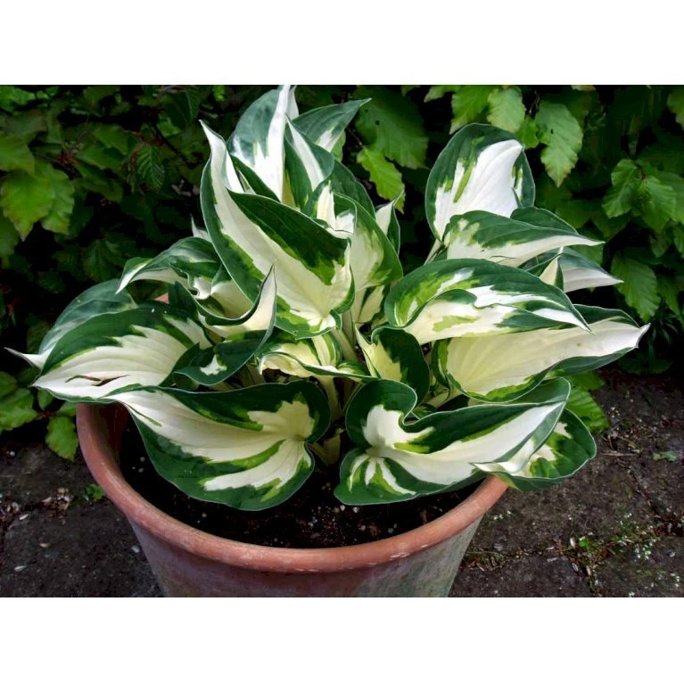 Store hvide blade med uregelmæssig mørkegrøn rand. Velegnet til afskæring. Blomster og nye skud er spiselige.
