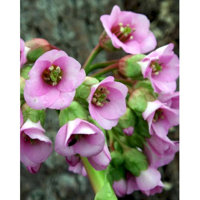 April – maj. Klokkeformede lysrosa blomster som sidder mange sammen på tykke stilke over de læderagtige blade.