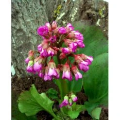 April – maj. Klokkeformede mørkt pink blomster som sidder mange samme på tykke stilke over de læderagtige blade.