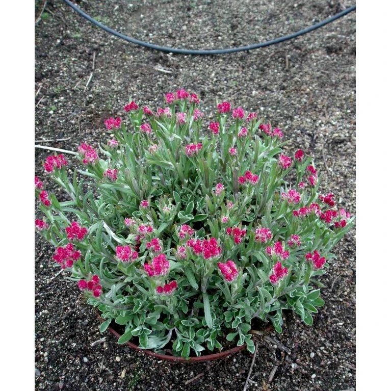 Maj-juni. Små lodne, mørkrosa blomster på dunede stilke over det grå løv