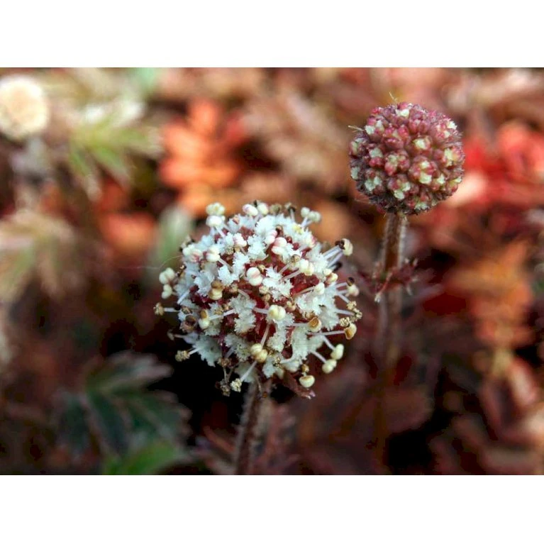 Juli til august, små hvide blomster i runde hoveder. Senere dekorative, kobberfarvede, piggede frøstande.