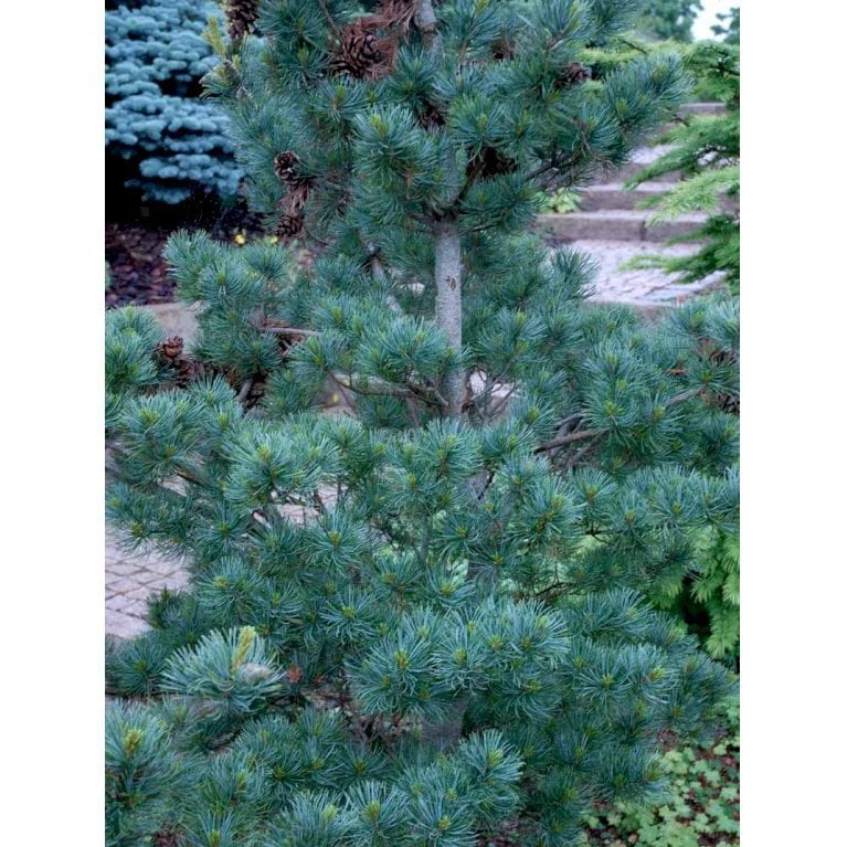 Lav, opretvoksende fyr.- Kort stamme, bred, pyramide krone. Nåleknipper, 5-nålede, blågrønne. Trives i sol – let skygge. Kogler mellemstore 5-10 cm store. Kræver mellem gødning og er fuldt ud hårdfør under danske forhold. Bliver under normale forhold omkring 4 – 6 m høj og 90 – 120 cm bred.