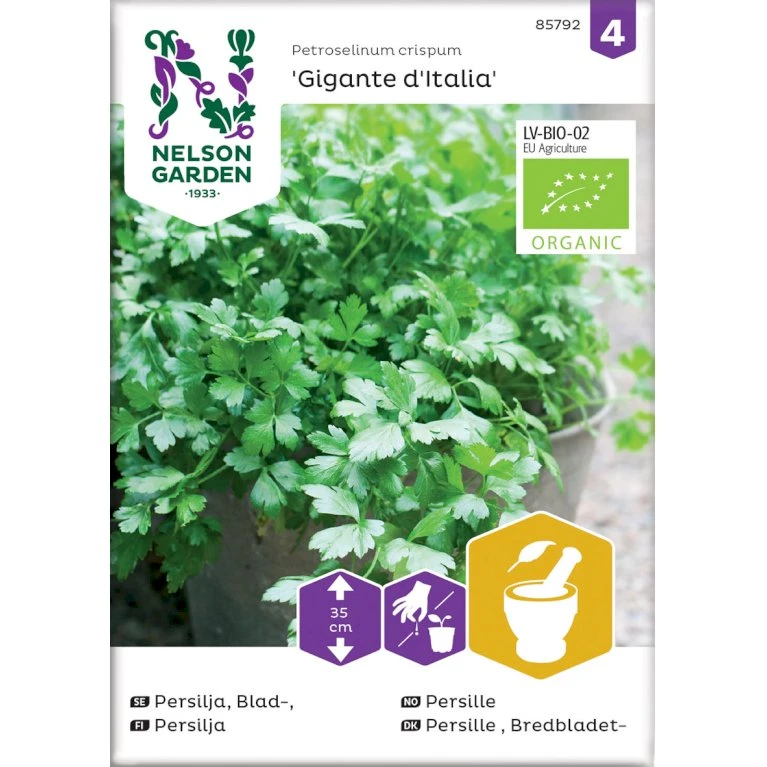 Juni-oktober ved forårssåning, samt en forårshøst ved efterårssåning eller overvintring. Dekorativ og smagsfuld persille med glatte, brede blade.