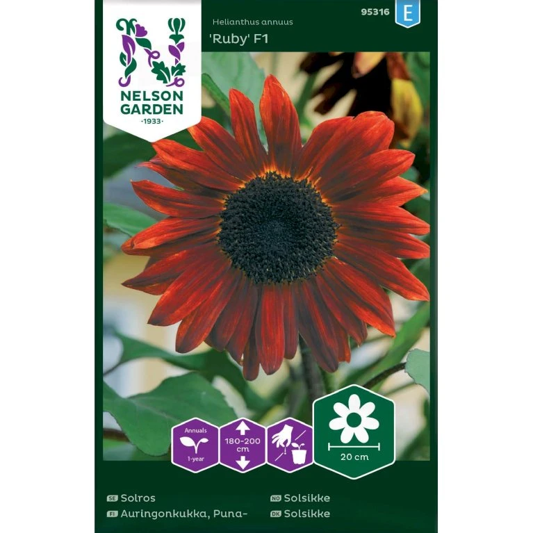 Den populære solsikke i ny skikkelse: store, dybt rubinrøde blomster der vækker opmærksomhed. Trives i veldrænet jord. Knopperne smager godt let kogte med lidt smør, og også frøene kan spises. Fin snitblomst og et blikfang i bedet.