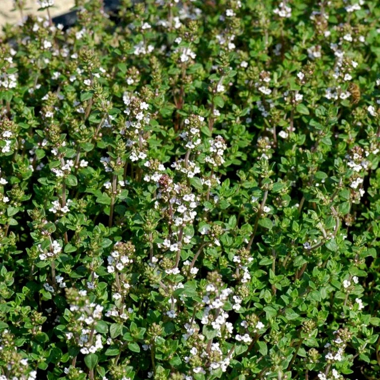 Juli-september. Aromatiske, stedsegrønne timian med små, mørkegrønne blade. Får små rosa blomster, som tiltrækker bier og andre nytteinsekter.