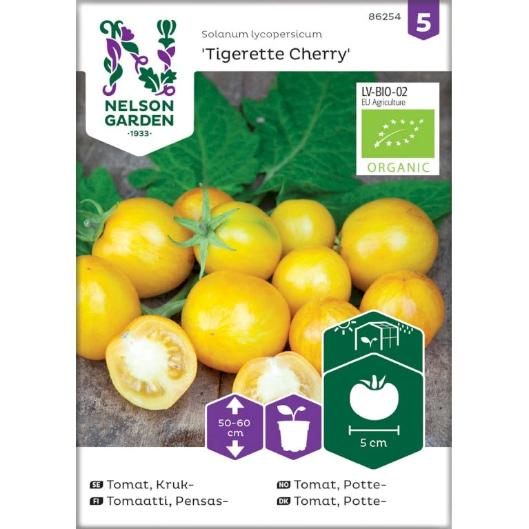 ‘Tigerette Cherry’ er en dekorativ og velsmagende, gulskindet tomat, som er velegnet til salatskålen.