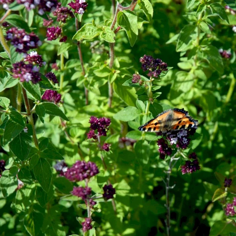 Økologiske frø. Oregano er en aromatisk krydderurt som blomstrer med blå blomster. Høst bladene løbende og brug dem ferske eller høst hele kviste til tørring. Skønt krydderi over tomater og fetaost.