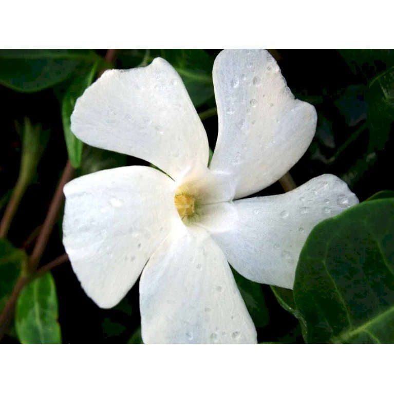 Vinca ‘Alba’ blomstrer med mange hvide blomster april-maj. Ofte ses nogen efterblomstring i eftersommeren.